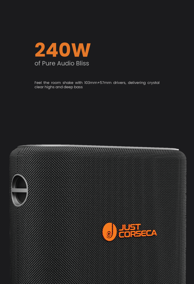 1× JC Sonic Surge 240W Speaker 1× Type-C Charging Cable 1× AUX Cable 1× Belt Strap 1× User Manual 1× Warranty Card |